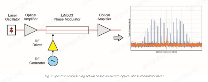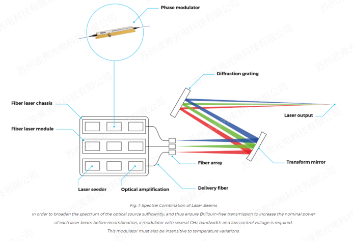 這些激光器中的每一路都通過電光相位調制器進行頻率調制,后者對于抑制光纖中的非線性布里淵效應(也稱為受激布里淵散射SBS)是尤為必要的。事實上,在光纖中傳輸的過大功率會在玻璃結構中引發聲格振動。這種振動會導致布拉格光柵效應限制光的傳輸:相當一部分光被反射,可能會損壞種子光源及其增益介質。抑制布里淵效應的一個行之有效的方法是展寬激光器的線寬(頻率調制)。通過鏈路中加入電光相位調制器,使這項技術成為可能。因此,在光譜合成系統中,每個通道的窄線寬激光器后面都配備有一個或者多個相位調制器。