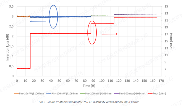 iXblue相位調制器NIR-MPX為1064 nm近紅外波段開發,得益于對“質子退火交換”(APE)波導制造工藝的技術掌握(也用于我們自己的光纖螺儀中的Y波導),因此,APE波導可以承受幾百毫瓦的光強。
