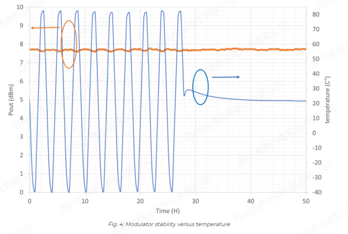 由于激光系統可能需要在戶外和具有挑戰性的環境中工作,因此對調制器進行了長時間溫度循環測試。溫度(藍色曲線)從-40°C到+85°C,并記錄輸出功率(橙色曲線)。通過我們的特殊調制器工藝,調制器是非常穩定的,我們只觀察到在整個溫度范圍內0,2dB的微小變化。