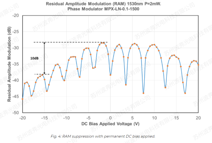 iXblue為PDH設(shè)計并優(yōu)化了專用于減小RAM的低頻相位調(diào)制器。RAM可以通過在調(diào)制器注入一個直流電壓而降低,該電壓對應(yīng)于鈮酸鋰波導(dǎo)一個整體的負折射率變化。一個5-15V直流電壓足以將RAM降低>10dB。