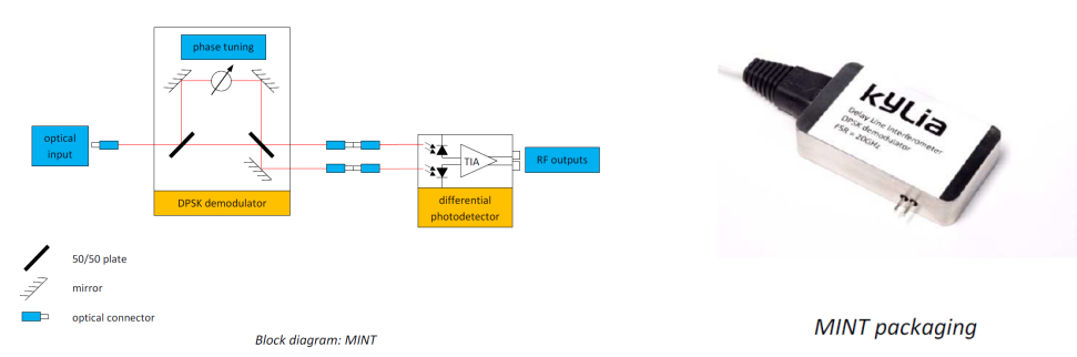 當對傳輸速率的需求高于Gbit/s時,必須開發新的調制和解調技術。基于自由空間設計和長期的電信技術背景iXblue能夠為這種復雜的解調提供各種產品。其中一系列產品(iXblue MICS系列,請聯系我們提供更多資料)致力于多路復用和解復用,這意味著能夠在一根獨特的光纖中傳輸許多不同波長的激光(即40路不同波長的激光束在一根典型的電信光纖中傳輸,1528至1560 nm,C波段,)。另一系列產品(iXblue MINT系列,見下圖)使用光的另一個特性進行解調,即電磁波的相位,相位(0或π)的調制比強度的調制更容易、更快。MINT產品使光學DPSK(差分相移鍵控)解調成為可能,它適用于大約10 Gbit/s的更高傳輸速率。i