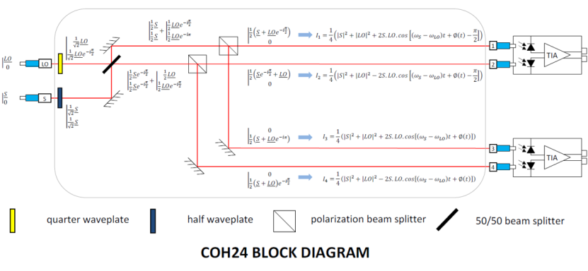 隨后產生了“QAM”技術,這是一種使用電磁波相位和強度的調制技術。除了前面的優點之外,該解決方案允許使用中間值(0和1之間,0和π之間)進行調制。它為信息編碼提供了更多的可能性。例如,QAM16和QAM64技術可以在單位比特時間內處理4到6比特。這種信號的解調非常復雜,可以通過iXblue 90°光學混頻方案(iXblue COH系列,見下圖)實現。信號光的相位、振幅甚至偏振態,通過信號光和本振光(特定頻率的參考光)之間執行四次90°相位干涉。