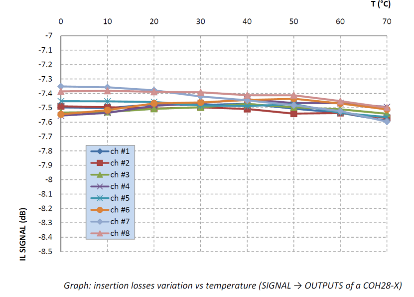 感謝最初為電信行業開發的環氧樹脂技術,iXblue器件可以提供穩定、堅固的特性。下圖為COH光混頻器優異的溫度性能,插損隨溫度的變化極小,滿足苛刻環境下的應用要求。