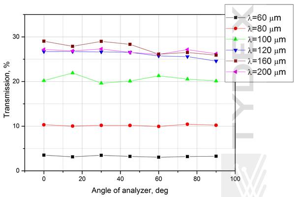 圖5. APC L/4@60-300 um的測量透射率作為分析儀角度β的函數