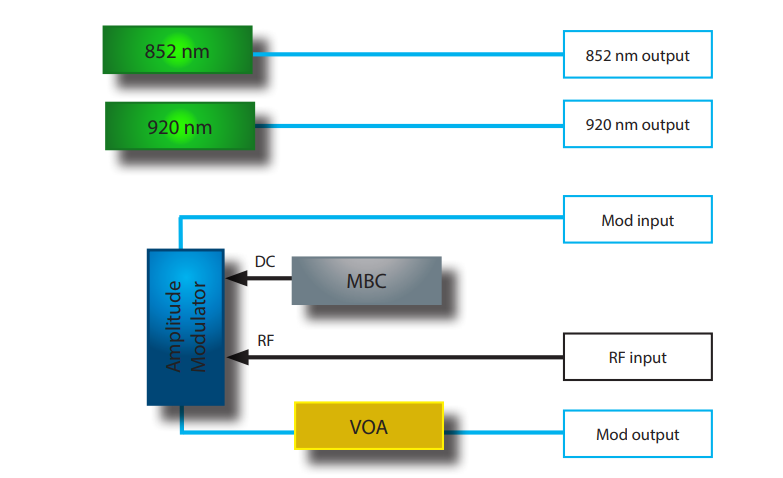 ? 內嵌兩個激光源,一個852 nm和920 nm低RIN DBR激光器。為了便于使用,省略了一根外部接插線,將激光輸出連接到調制器輸入光端口。波長和功率可通過前面板控制或ModBox軟件接口進行調整。