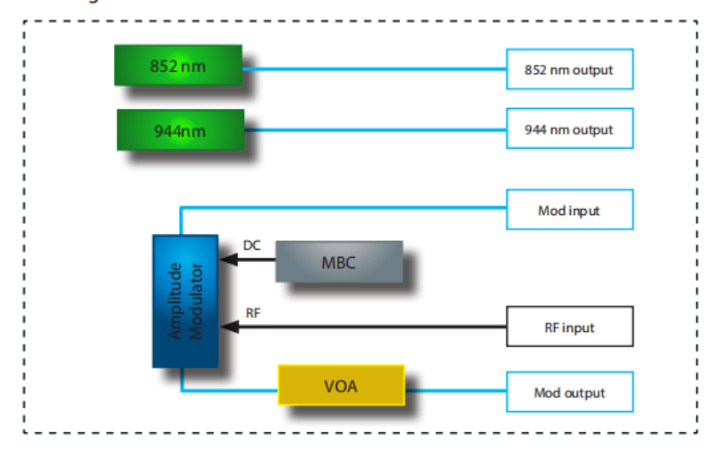 ? 內嵌兩個激光源,一個852 nm和944 nm低RIN DBR激光器。為了便于使用,省略了一根外部接插線,將激光輸出連接到調制器輸入光端口。波長和功率可通過前面板控制或ModBox軟件接口進行調整。