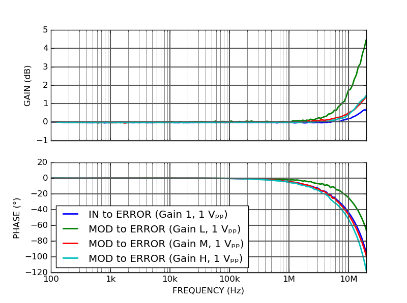 Bode plot of the transfer functions from the signal and modulation inputs to the error output: