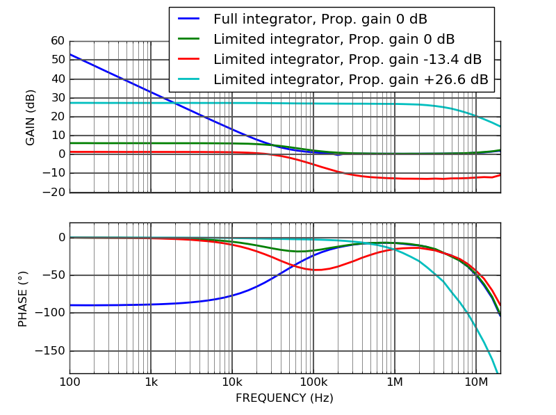 Transfer functions between the input and the fast output. Fast integrator gain is set to its minimum value (47 kHz). Global gain is -20 dB and input signal is 150 mVpp.